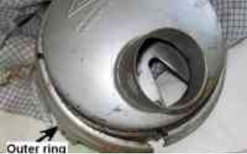 A self tapping screw will be used to realign the outer ring with the main air cleaner body and the offset carburetor air inlet tube when re-assembling the air cleaner ( photo 13 ). |