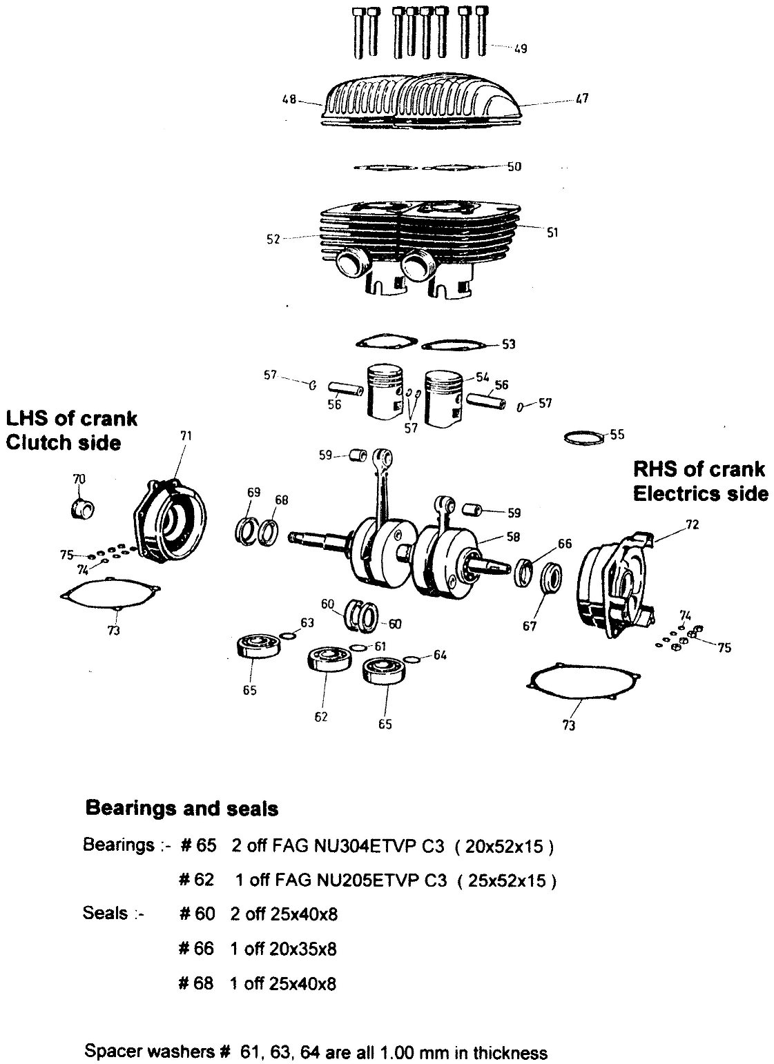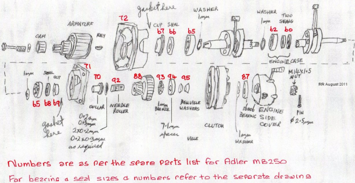 New articles are always welcome. The aim of the web site is to provide information & help in the restoration & running of the Adler. Engine rebuild Details provided by Rowan Bond in Australia. Kawasaki A1 Samuri con rods are almost exactly the same length ( slight increase in compression ). If your pistons are too worn, obtain a set of Suzuki GT250 pistons and rings which are perfect except for a very slight loss of compression ( see con rod length ). Modern bearing and seal sizes for the crankshaft are:- Seals for the crank are 3 of 25x40x8 p/n PR8094 and 1 of 20x35x8 p/n not known. I did have problems sourcing the seals for the kickstart and gear selector shaft which are 17x27x7 and also the fork seals which are 22x32x7. HINT, When you pass the left hand crank shaft through the centre bearing and seals make up a gadget to lead the crank through the seals ( wood or metal shaft ) with a spigot to go into the threaded section and the outside diameter slightly larger than the inside diameter of the seal or the Hirth coupling teeth will tear your seals so shreds. Exhaust design Different outlet diameters ( using plugs at the end of the pipe ) , were tried with the following results :- With modified ports and heads , the motor produced 36 HP with maximum revs of 12000 with 14:1 compression , running on methanol and achieved a top speed of 120 mph. John Wynne the builder of the car, is now retired to the Gold Coast in Australia but the Adler powered car still resides in his garage. Ignition coil replacement Firstly the charging system. The original Bosch regulator is sited at the front of the ignition setup of the motorcycle under the right cover. Coil replacement. The coils failed shortly after this modification and that presented much more problems. I removed the coils and had them tested. Having looked around, I found a couple of neat coils off a Honda CB100 which were black, would fit under the tank and easily mounted off a fabricated bracket attached above the front tank mount. Wiring detail from the original owners manual is included for your information. I considered making up dummy HT leads to look original, however Adlers are so rare, no-one has picked up the modifications in 14 years. |